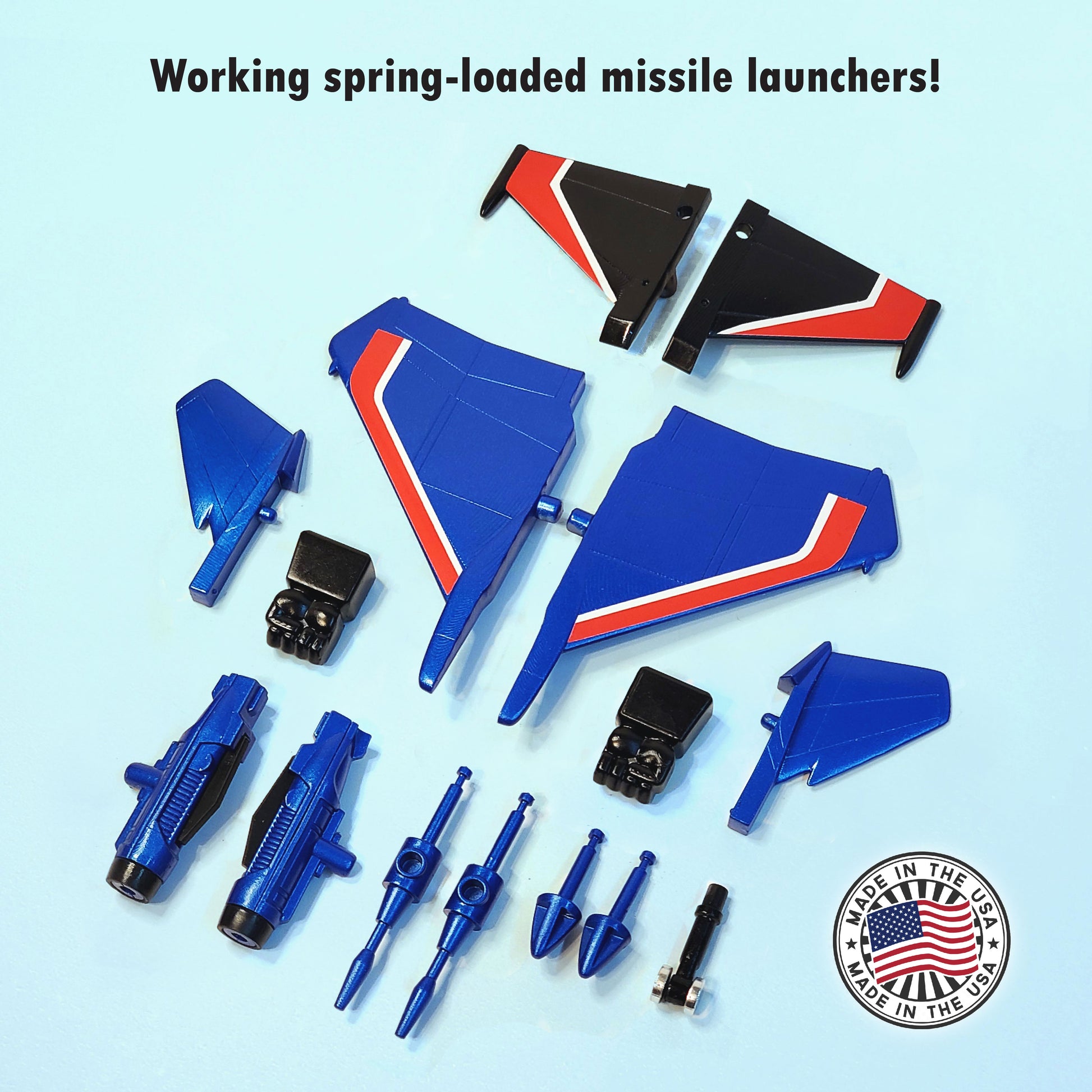 These parts are also specially designed to be cross-compatible with original parts! They were scratch built in CAD and 3D Printed to the best of my ability. Almost every part in this set is Resin Printed. The colors are about as close as I could possibly get. This set features working spring-loaded missile launchers! (don't aim these at your eyes or face). This set also includes 2 sets of stickers: the Wings and Faction Symbols (The wing stickers are pre-applied; please contact me if you wish to have them packaged alongside instead).